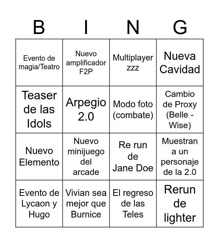This bingo card has 16 words: Vivian sea mejor que Burnice, Muestran a un personaje de la 2.0, Multiplayer zzz, Evento de magia/Teatro, Nuevo Elemento, Nuevo amplificador F2P, Re run de Jane Doe, El regreso de las Teles, Teaser de las Idols, Arpegio 2.0, Evento de Lycaon y Hugo, Nueva Cavidad, Nuevo minijuego del arcade, Cambio de Proxy (Belle - Wise), Modo foto (combate) and Rerun de lighter.