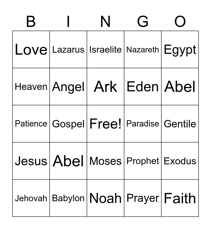 This bingo card has a free space and 25 words: Abel, Noah, Ark, Jehovah, Egypt, Love, Heaven, Lazarus, Paradise, Moses, Eden, Patience, Prophet, Exodus, Angel, Ransom, Gentile, Israelite, Abel, Gospel, Faith, Babylon, Jesus, Nazareth and Prayer.