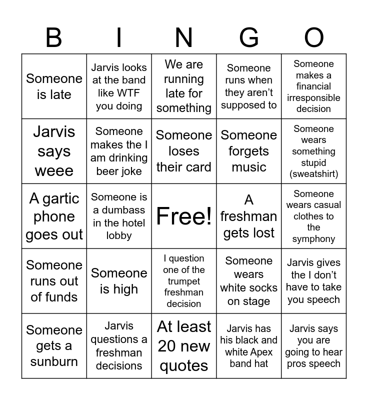 This bingo card has a free space and 24 words: Someone is high, Jarvis questions a freshman decisions, Someone loses their card, Someone gets a sunburn, Someone makes a financial irresponsible decision, Someone is late, Jarvis says weee, Jarvis looks at the band like WTF you doing, A freshman gets lost, I question one of the trumpet freshman decision, Someone forgets music, A gartic phone goes out, Someone wears white socks on stage, Jarvis gives the I don’t have to take you speech, Someone makes the I am drinking beer joke, Jarvis has his black and white Apex band hat, Someone wears casual clothes to the symphony, We are running late for something, Someone wears something stupid (sweatshirt), Someone is a dumbass in the hotel lobby, Jarvis says you are going to hear pros speech, Someone runs out of funds, Someone runs when they aren’t supposed to and At least 20 new quotes.