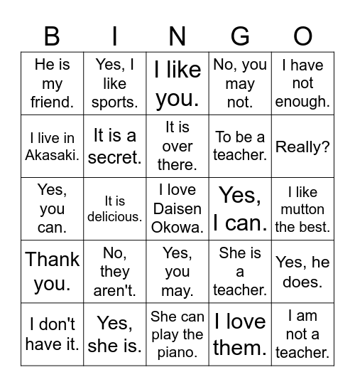 This bingo card has 164 words: Free!, By bus, To see my friends., In the Library., No, you can't., I'm happy to hear that., I have some., She is nice., He is not my friend., He is nice., Really?, Are you kidding!?, It is a secret., Don't say that., To be a teacher., You are really nice., It is in my house., I like them., I know him., I don't play it., No, I won't., Yes, I do., Yes, I will., I don't want it., I like to go shopping., No, I don't., You can see it in America., That is Doraemon., But, I am so tired., I don't have money., His name is Koji., He is not my friend., It is delicious., Don't say that., No way!!!, I don't know., I don't want to do that., It is in my pocket., I don't like them., She is my friend., I love it., No, I didn't., It is natto., I am interested in it., Yes, I did., He is really nice., I know her., I don't know him., I don't know her., She is not my friend., By bus., Yes, I am., No, I am not., Yes, you are., No, you aren't., Yes, he is., No, he isn't., Yes, she is., No, she isn't., Yes. it is., No, it isn't., Yes, they are., No, they aren't., Yes, I do., No, I don't., Yes, he does., No, he doesn't., Yes, they do., No, they don't., Yes, I can., No, I can't., Yes, you can., No, you can't., I have one., I have none., I have some., I have never been there., I like it., I will go there soon., She is a teacher., I like to go camping., I live in Akasaki., It's mine., It is near Yonago station., Yes, I went there on Sunday., It is behind you., I don't have it., No, she doesn't., Yes, you may., No, you may not., Yes, I have., No, I haven't., It is in my car., It is in Koji's car., I don't like him., I don't like her., He is my friend., I don't like it., Oh, really?, I have never done it before., I want to do that., Thank you., I like him., I like her., I love them., No, I didn't., No, he didn't., No, she didn't., It is over there., It is under the table., It is on the wall., It is over the mountain., It is between Daisen-town and Yonago., It is by the school., It is on the toilet seat., It is in heaven., It is inside your bag., I don't believe you., It is unbelievable., What!!?, I am fine, thanks., You look nice., That is nice., She can play the piano., She can play baseball., He likes to play basketball., She likes playing volleyball., Yes, I like sports., No, I don't like it., I am not a student., I am not a teacher., I am a student., I am a teacher., I like you., Good!, That great!, That is wonderful., That is awesome., He is from the Netherlands., He is from the U.K., No, I don't speak Japanese., Yes, I can speak English., He speaks Japanglish., I like tea more than coffee., I like beef more than pork., I like mutton the best., I like doing BBQs., I like wine the best of all drinks., I love Daisen Okowa., I don't want to go there., I have two., I have three., I have four., I have ten., I have too many., I have not enough., I want more., I don't want more., I like watching anime., I like watching movies., I like listening to music., I like to go driving., I like to go snowboarding. and I like to go skiing..
