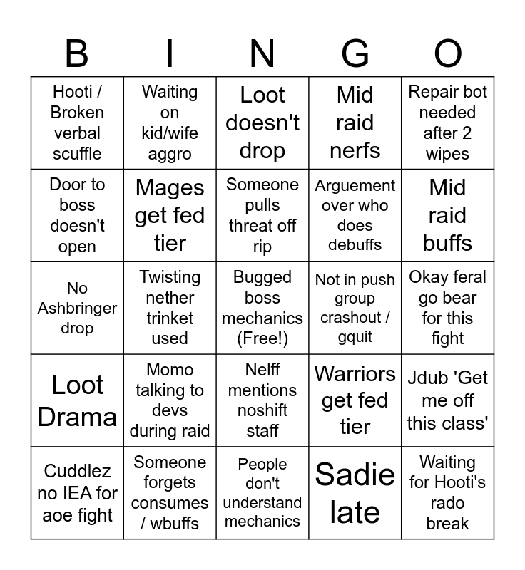 This bingo card has a free space and 24 words: Momo talking to devs during raid, Someone forgets consumes / wbuffs, Someone pulls threat off rip, Cuddlez no IEA for aoe fight, Repair bot needed after 2 wipes, Hooti / Broken verbal scuffle, Door to boss doesn't open, Waiting on kid/wife aggro, Not in push group crashout / gquit, Nelff mentions noshift staff, Arguement over who does debuffs, No Ashbringer drop, Warriors get fed tier, Jdub 'Get me off this class', Mages get fed tier, Sadie late, Okay feral go bear for this fight, Loot doesn't drop, Mid raid buffs, Twisting nether trinket used, Waiting for Hooti's rado break, Loot Drama, Mid raid nerfs and People don't understand mechanics.