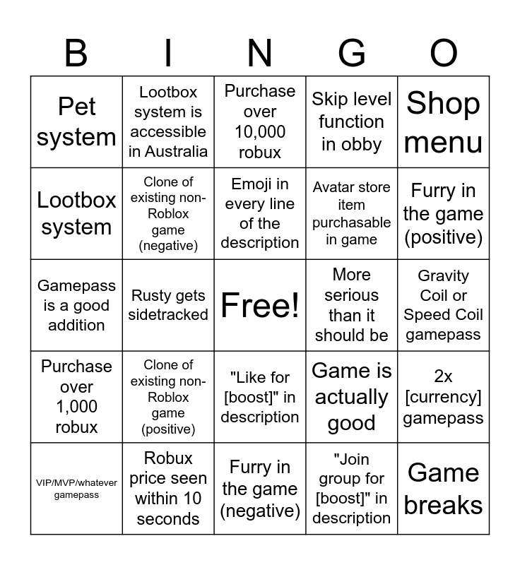 This bingo card has a free space and 26 words: "Like for [boost]" in description, "Join group for [boost]" in description, Emoji in every line of the description, Robux price seen within 10 seconds, Shop menu, Pet system, Lootbox system, Lootbox system is accessible in Australia, Gravity Coil or Speed Coil gamepass, Game is actually good, Avatar store item purchasable in game, Gamepass is a good addition, 2x [currency] gamepass, VIP/MVP/whatever gamepass, Rusty gets sidetracked, Pure slop game, Skip level function in obby, Purchase over 1,000 robux, Purchase over 10,000 robux, Game breaks, Furry in the game (positive), Furry in the game (negative), More serious than it should be, Clone of existing non-Roblox game (positive), Clone of existing non-Roblox game (negative) and No gamepasses at all.