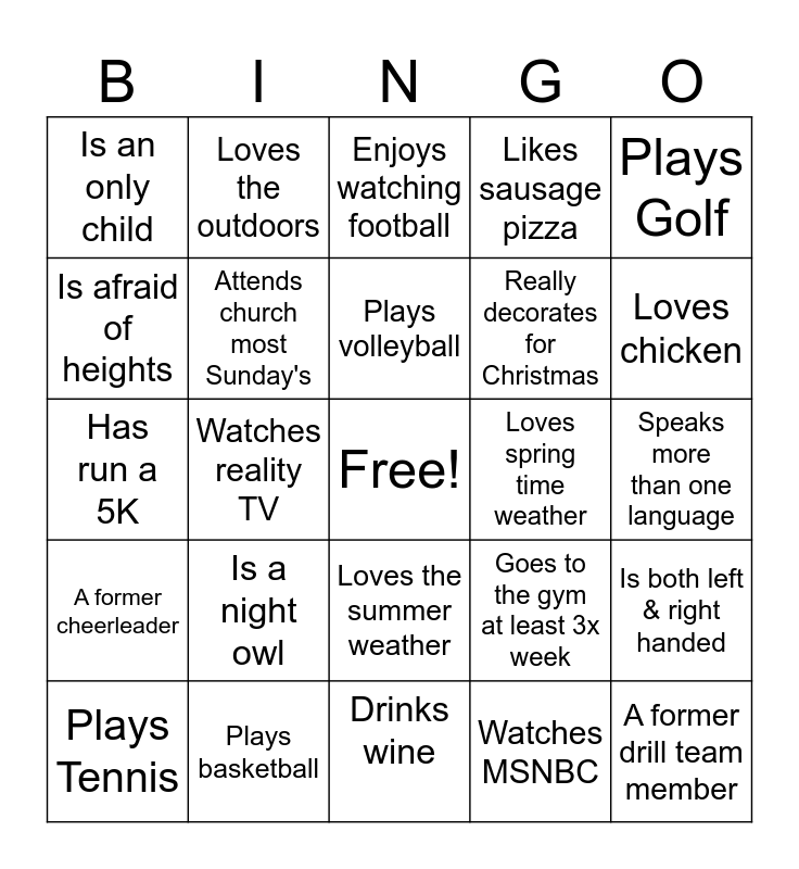 This bingo card has a free space and 24 words: Is a night owl, Plays basketball, Plays volleyball, Plays Tennis, Plays Golf, Is an only child, Is afraid of heights, Loves the outdoors, Loves spring time weather, Loves the summer weather, Really decorates for Christmas, Has run a 5K, Goes to the gym at least 3x week, Is both left & right handed, Attends church most Sunday's, Watches MSNBC, Speaks more than one language, Enjoys watching football, Loves chicken, Watches reality TV, A former drill team member, A former cheerleader, Likes sausage pizza and Drinks wine.