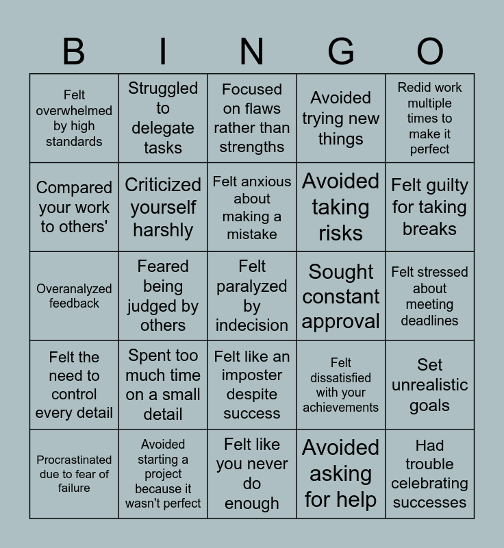 This bingo card has a free space and 24 words: Spent too much time on a small detail, Avoided starting a project because it wasn't perfect, Felt anxious about making a mistake, Procrastinated due to fear of failure, Redid work multiple times to make it perfect, Felt overwhelmed by high standards, Compared your work to others', Struggled to delegate tasks, Sought constant approval, Felt like an imposter despite success, Avoided taking risks, Overanalyzed feedback, Felt dissatisfied with your achievements, Set unrealistic goals, Criticized yourself harshly, Avoided asking for help, Felt stressed about meeting deadlines, Focused on flaws rather than strengths, Felt guilty for taking breaks, Feared being judged by others, Had trouble celebrating successes, Felt the need to control every detail, Avoided trying new things and Felt like you never do enough.