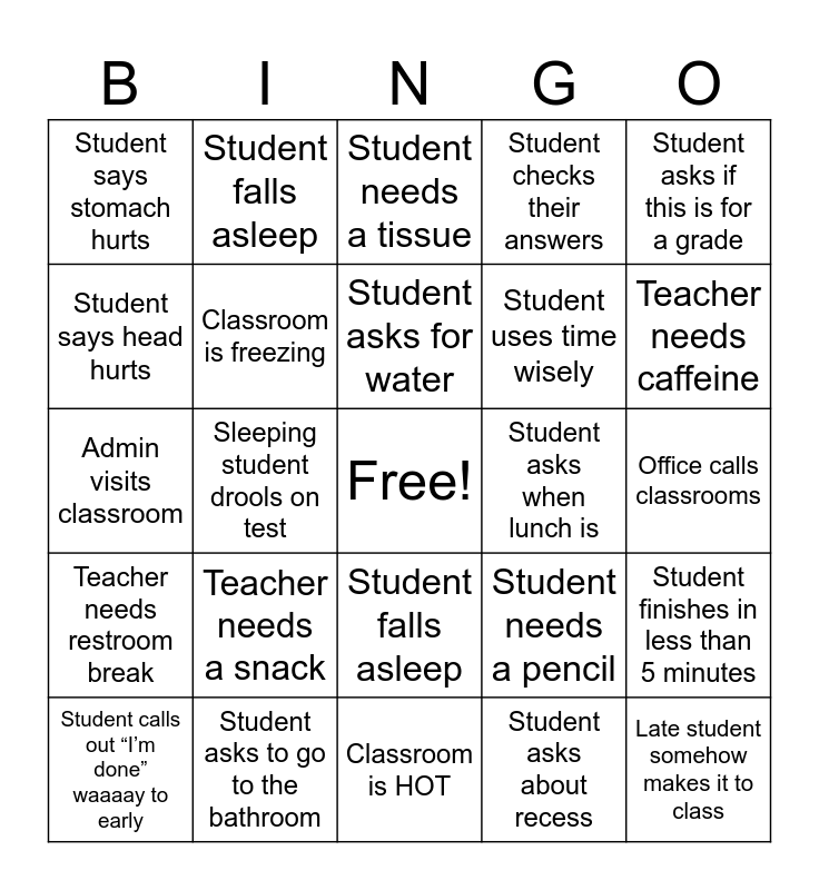 This bingo card has a free space and 24 words: Teacher needs a snack, Student asks to go to the bathroom, Student asks for water, Student calls out “I’m done” waaaay to early, Student asks if this is for a grade, Student says stomach hurts, Student says head hurts, Student falls asleep, Student asks when lunch is, Student falls asleep, Student uses time wisely, Admin visits classroom, Student needs a pencil, Student finishes in less than 5 minutes, Classroom is freezing, Student asks about recess, Office calls classrooms, Student needs a tissue, Teacher needs caffeine, Sleeping student drools on test, Late student somehow makes it to class, Teacher needs restroom break, Student checks their answers and Classroom is HOT.