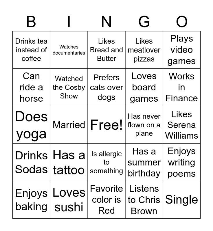 This bingo card has a free space and 24 words: Has a tattoo, Loves sushi, Prefers cats over dogs, Enjoys baking, Plays video games, Drinks tea instead of coffee, Can ride a horse, Watches documentaries, Has never flown on a plane, Is allergic to something, Loves board games, Does yoga, Has a summer birthday, Enjoys writing poems, Watched the Cosby Show, Listens to Chris Brown, Likes Serena Williams, Likes Bread and Butter, Works in Finance, Married, Single, Drinks Sodas, Likes meatlover pizzas and Favorite color is Red.