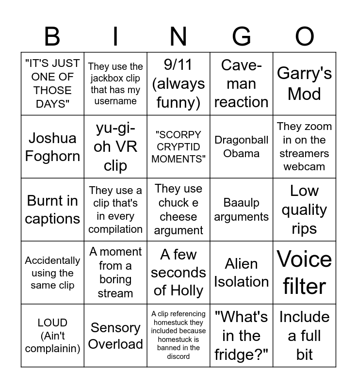 This bingo card has a free space and 24 words: A moment from a boring stream, Sensory Overload, "SCORPY CRYPTID MOMENTS", LOUD (Ain't complainin), Garry's Mod, "IT'S JUST ONE OF THOSE DAYS", Joshua Foghorn, They use the jackbox clip that has my username, Baaulp arguments, A few seconds of Holly, Dragonball Obama, Burnt in captions, Alien Isolation, Voice filter, yu-gi-oh VR clip, "What's in the fridge?", Low quality rips, 9/11 (always funny), They zoom in on the streamers webcam, They use a clip that's in every compilation, Include a full bit, Accidentally using the same clip, Cave-man reaction and A clip referencing homestuck they included because homestuck is banned in the discord.