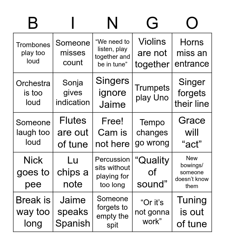 This bingo card has a free space and 24 words: Lu chips a note, Jaime speaks Spanish, Singers ignore Jaime, Break is way too long, Horns miss an entrance, Trombones play too loud, Orchestra is too loud, Someone misses count, Tempo changes go wrong, Percussion sits without playing for too long, Trumpets play Uno, Someone laugh too loud, “Quality of sound”, New bowings/ someone doesn’t know them, Sonja gives indication, “Or it’s not gonna work”, Grace will “act”, “We need to listen, play together and be in tune”, Singer forgets their line, Flutes are out of tune, Tuning is out of tune, Nick goes to pee, Violins are not together and Someone forgets to empty the spit.