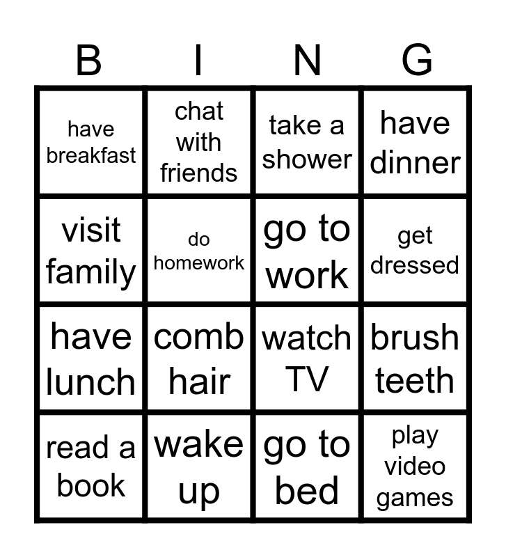 This bingo card has 16 words: wake up, brush teeth, take a shower, have breakfast, have lunch, chat with friends, watch TV, go to bed, visit family, do homework, read a book, have dinner, comb hair, get dressed, go to work and play video games.