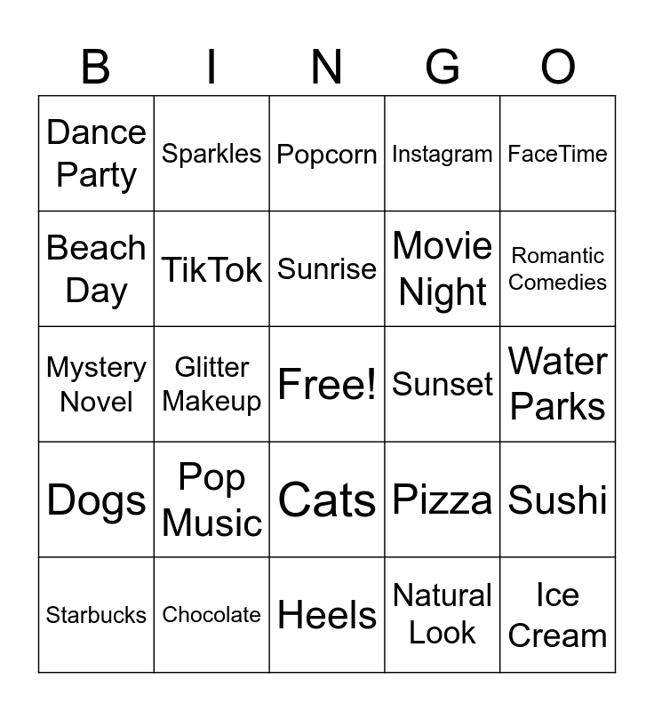 This bingo card has a free space and 48 words: Cake, Ice Cream, Sneakers, Heels, Pop Music, Indie Music, Sparkles, Pastels, Beach Day, Theme Park, TikTok, Instagram, Sushi, Pizza, Shopping Spree, Spa Day, Sunrise, Sunset, Snapchat, FaceTime, Glitter Makeup, Natural Look, Dance Party, Movie Night, Horror Movies, Romantic Comedies, Starbucks, Dunkin', Cats, Dogs, Jeans, Dresses, Netflix Binge, Outdoor Adventure, Chocolate, Vanilla, Theme Parks, Water Parks, Group Selfie, Solo Glam Shot, Nail Art, Classic Nails, Popcorn, Candy, Mystery Novel, Love Story, Roller Coaster and Ferris Wheel.