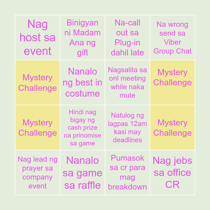 This bingo card has 16 words: Nanalo sa game sa raffle, Mystery Challenge, Na-call out sa Plug-in dahil late, Nag host sa event, Mystery Challenge, Binigyan ni Madam Ana ng gift, Natulog ng lagpas 12am kasi may deadlines, Pumasok sa cr para mag breakdown, Mystery Challenge, Nanalo ng best in costume, Nag lead ng prayer sa company event, Na wrong send sa Viber Group Chat, Hindi nag bigay ng cash prize na prinomise sa game, Mystery Challenge, Nagsalita sa onl meeting while naka mute and Nag jebs sa office CR.