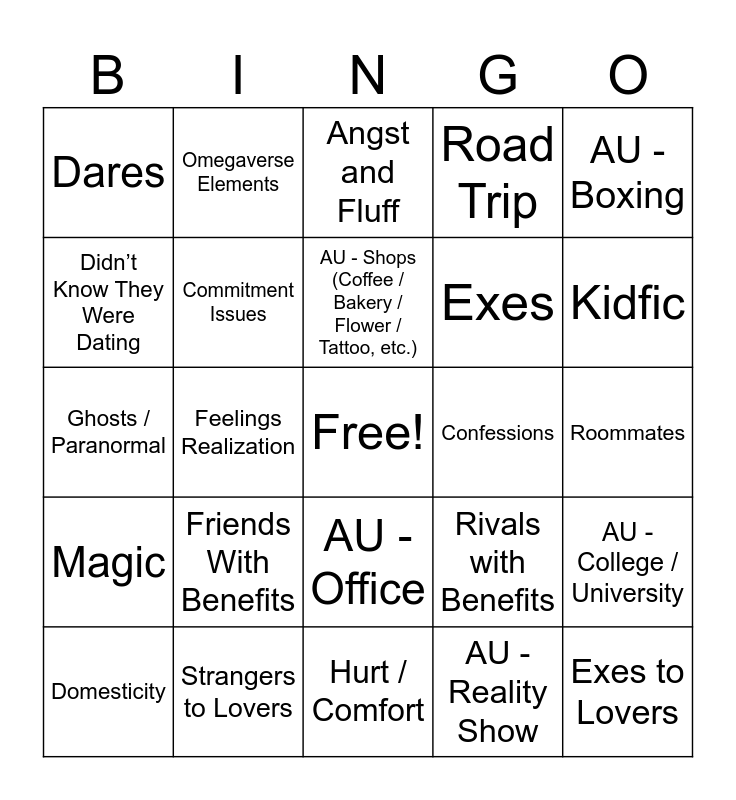 This bingo card has a free space and 83 words: 3+1 / 5+1 Times, Angst, Angst and Fluff, Animals / Pets, Arranged Marriage, Based on Other Media, Blind Date, Canon Compliant, Celestial Beings, Chan POV, Childhood Friends, Childhood Sweethearts, Commitment Issues, Confessions, Coworkers, Dares, Domesticity, Didn’t Know They Were Dating, Dreams, Enemies / Rivals to Lovers, Established Relationship, Exes, Exes to Lovers, Fake Dating, Feelings Realization, Firsts, Fluff, Food / Cooking, Forbidden Love, Found Family, Friends With Benefits, Friends to Lovers, Gender Changes, Ghosts / Paranormal, Handholding, Happy Ending, Hurt / Comfort, Idiots in Love, Kidfic, Magic, Marriage / Married Life / Weddings, Marriage of Convenience, Minho POV, Mistaken Identity, Mutual Pining, Neighbors, Omegaverse Elements, One Night Stands, Partners in Crime, Pining, Rivals with Benefits, Road Trip, Roommates, Secret Admirer, Sharing a Bed, Sickfic, Slice of Life, Soulmates, Strangers to Lovers, Supernatural Elements, Time (Travel, Loops, etc.), Trapped Together, AU - Bodyguard, AU - Boxing, AU - Canon Divergent, AU - College / University, AU - Different First Meeting, AU - Fantasy, AU - Inspired by SKZ MV, AU - Modern, AU - Modern with Magic, AU - Multiverse, AU - Non-Idol Celebrity, AU - Office, AU - Reality Show, AU - Rock Band, AU - Royalty, AU - Shops (Coffee / Bakery / Flower / Tattoo, etc.), AU - Small Town, AU - Spies / Secret Agents, AU - Teachers, AU - Vampires and AU - Werewolves.
