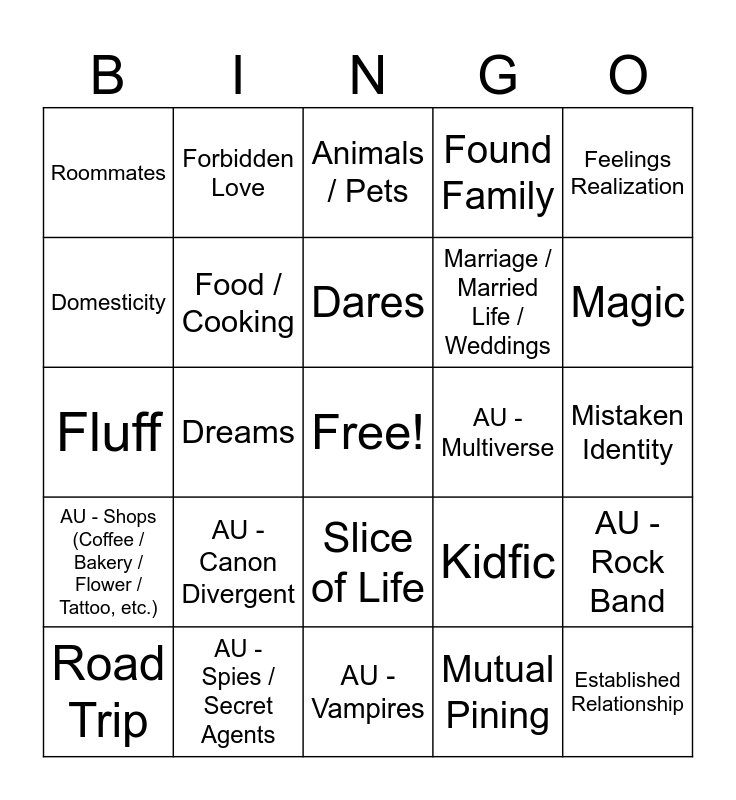 This bingo card has a free space and 77 words: 3+1 / 5+1 Times, Angst and Fluff, Animals / Pets, Arranged Marriage, Blind Date, Canon Compliant, Chan POV, Childhood Friends, Childhood Sweethearts, Commitment Issues, Confessions, Coworkers, Dares, Domesticity, Didn’t Know They Were Dating, Dreams, Enemies / Rivals to Lovers, Established Relationship, Fake Dating, Feelings Realization, Firsts, Fluff, Food / Cooking, Forbidden Love, Found Family, Friends With Benefits, Friends to Lovers, Ghosts / Paranormal, Handholding, Happy Ending, Hurt / Comfort, Hybrids, Idiots in Love, Kidfic, Magic, Marriage / Married Life / Weddings, Marriage of Convenience, Minho POV, Mistaken Identity, Mutual Pining, Neighbors, Omegaverse Elements, One Night Stands, Partners in Crime, Pining, Rivals with Benefits, Road Trip, Roommates, Secret Admirer, Sharing a Bed, Sickfic, Slice of Life, Slow Burn, Soulmates, Strangers to Lovers, Supernatural Elements, Time (Travel, Loops, etc.), Trapped Together, AU - Bodyguard, AU - Boxing, AU - Canon Divergent, AU - College / University, AU - Different First Meeting, AU - Fantasy, AU - Inspired by SKZ MV, AU - Modern, AU - Modern with Magic, AU - Multiverse, AU - Non-Idol Celebrity, AU - Office, AU - Reality Show, AU - Rock Band, AU - Shops (Coffee / Bakery / Flower / Tattoo, etc.), AU - Spies / Secret Agents, AU - Teachers, AU - Vampires and AU - Werewolves.