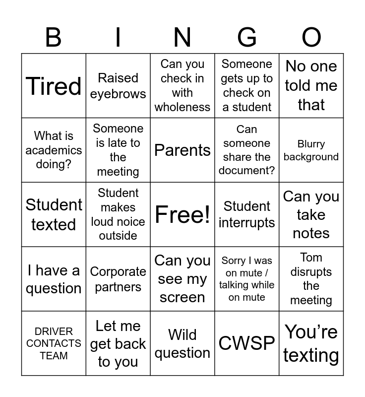This bingo card has a free space and 24 words: DRIVER CONTACTS TEAM, Corporate partners, Parents, CWSP, No one told me that, Tired, Raised eyebrows, Can you check in with wholeness, Student interrupts, Can you take notes, Student texted, Someone is late to the meeting, Sorry I was on mute / talking while on mute, Tom disrupts the meeting, What is academics doing?, Let me get back to you, Wild question, Someone gets up to check on a student, Blurry background, I have a question, Student makes loud noice outside, Can you see my screen, Can someone share the document? and You’re texting.