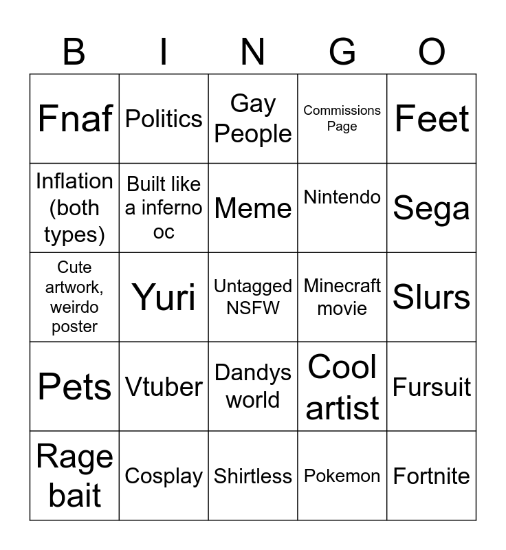 This bingo card has a free space and 24 words: Vtuber, Cosplay, Meme, Rage bait, Feet, Fnaf, Inflation (both types), Politics, Minecraft movie, Dandys world, Nintendo, Cute artwork, weirdo poster, Cool artist, Fursuit, Built like a inferno oc, Pokemon, Slurs, Gay People, Sega, Yuri, Fortnite, Pets, Commissions Page and Shirtless.