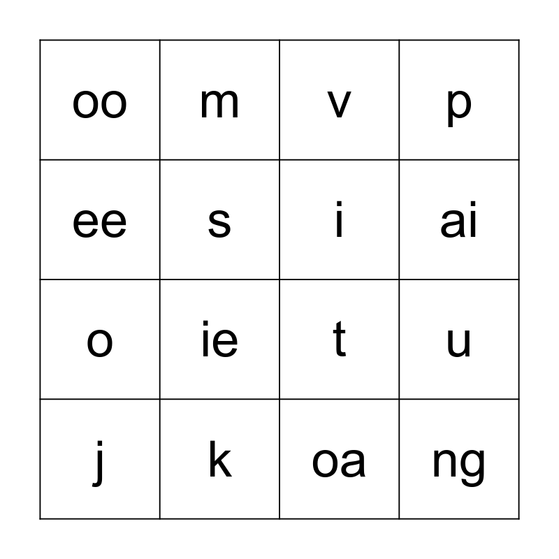 This bingo card has a free space and 15 words: j, ng, v, oo, ai, ee, ie, oa, s, o, u, p, i, m and k.