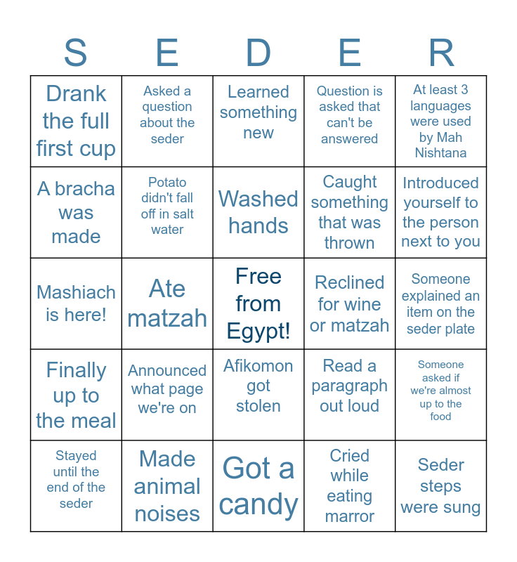 This bingo card has a free space and 34 words: Kept all your matzah crumbs on the table, Cried while eating marror, Someone spilled wine, Sang Mah Nishtana, Finally up to the meal, Potato didn't fall off in salt water, At least 3 languages were used by Mah Nishtana, Stayed until the end of the seder, Asked a question about the seder, Shared something you're grateful for, Washed hands, Learned something new, Leaned on the person next to you, Passed the 10 makkos, Reclined for wine or matzah, Introduced yourself to the person next to you, Made animal noises, Mashiach is here!, Announced what page we're on, Read a paragraph out loud, Afikomon got stolen, Door opened for Eliyahu, Drank the full first cup, Someone explained an item on the seder plate, Got a candy, Seder steps were sung, Question is asked that can't be answered, Matzah got broken "evenly", Caught something that was thrown, A bracha was made, Sang Dayeinu, Ate matzah, Someone asked if we're almost up to the food and Ate brisket at the meal.