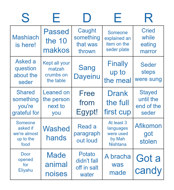 This bingo card has a free space and 34 words: Someone spilled wine, A bracha was made, Matzah got broken "evenly", Reclined for wine or matzah, Someone asked if we're almost up to the food, Kept all your matzah crumbs on the table, Cried while eating marror, Door opened for Eliyahu, Passed the 10 makkos, Sang Mah Nishtana, Sang Dayeinu, Caught something that was thrown, Ate brisket at the meal, Introduced yourself to the person next to you, Drank the full first cup, Seder steps were sung, Made animal noises, Shared something you're grateful for, Washed hands, At least 3 languages were used by Mah Nishtana, Read a paragraph out loud, Learned something new, Mashiach is here!, Stayed until the end of the seder, Potato didn't fall off in salt water, Got a candy, Someone explained an item on the seder plate, Question is asked that can't be answered, Finally up to the meal, Asked a question about the seder, Announced what page we're on, Leaned on the person next to you, Afikomon got stolen and Ate matzah.