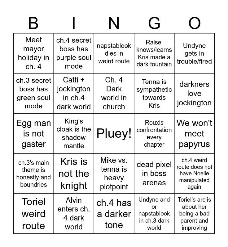 This bingo card has a free space and 24 words: Kris is not the knight, Alvin enters ch. 4 dark world, Ch. 4 Dark world in church, Toriel weird route, Undyne gets in trouble/fired, Meet mayor holiday in ch. 4, ch.3 secret boss has green soul mode, ch.4 secret boss has purple soul mode, Rouxls confrontation every chapter, Mike vs. tenna is heavy plotpoint, Tenna is sympathetic towards Kris, Egg man is not gaster, dead pixel in boss arenas, ch.4 weird route does not have Noelle manipulated again, Catti + jockington in ch.4 dark world, Undyne and or napstablook in ch.3 dark world, We won't meet papyrus, napstablook dies in weird route, darkners love jockington, King's cloak is the shadow mantle, Toriel's arc is about her being a bad parent and improving, ch.3's main theme is honestly and boundries, Ralsei knows/learns Kris made a dark fountain and ch.4 has a darker tone.