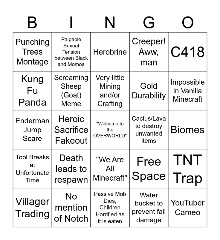 This bingo card has 25 words: Death leads to respawn, Passive Mob Dies, Children Horrified as it is eaten, Very little Mining and/or Crafting, Villager Trading, C418, Punching Trees Montage, Kung Fu Panda, Palpable Sexual Tension between Black and Momoa, Cactus/Lava to destroy unwanted items, "We Are All Minecraft", Gold Durability, Enderman Jump Scare, Free Space, TNT Trap, Screaming Sheep (Goat) Meme, YouTuber Cameo, Biomes, Herobrine, Impossible in Vanilla Minecraft, Heroic Sacrifice Fakeout, "Welcome to the OVERWORLD", No mention of Notch, Tool Breaks at Unfortunate Time, Creeper! Aww, man and Water bucket to prevent fall damage.