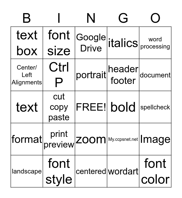 This bingo card has a free space and 24 words: print preview, font style, portrait, landscape, word processing, text box, Center/ Left Alignments, font size, bold, zoom, header footer, text, My.ccpsnet.net, Image, Ctrl P, wordart, spellcheck, Google Drive, document, cut copy paste, font color, format, italics and centered.