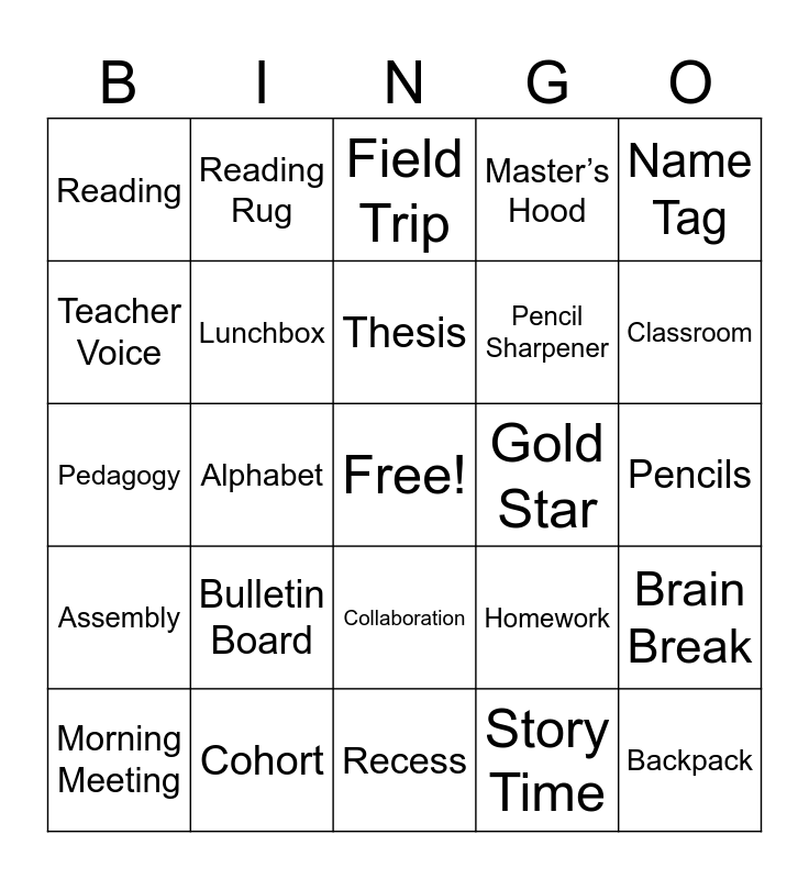 This bingo card has a free space and 31 words: Recess, Crayons, Alphabet, Math, Reading, Field Trip, Lunchbox, Homework, Gold Star, Story Time, Pencils, Backpack, Principal, Library, Classroom, Glue Stick, Brain Break, Bulletin Board, Assembly, Collaboration, Name Tag, Tattling, Morning Meeting, Reading Rug, Pencil Sharpener, Teacher Voice, Master’s Hood, Pedagogy, Cohort, Thesis and Educational Theory.
