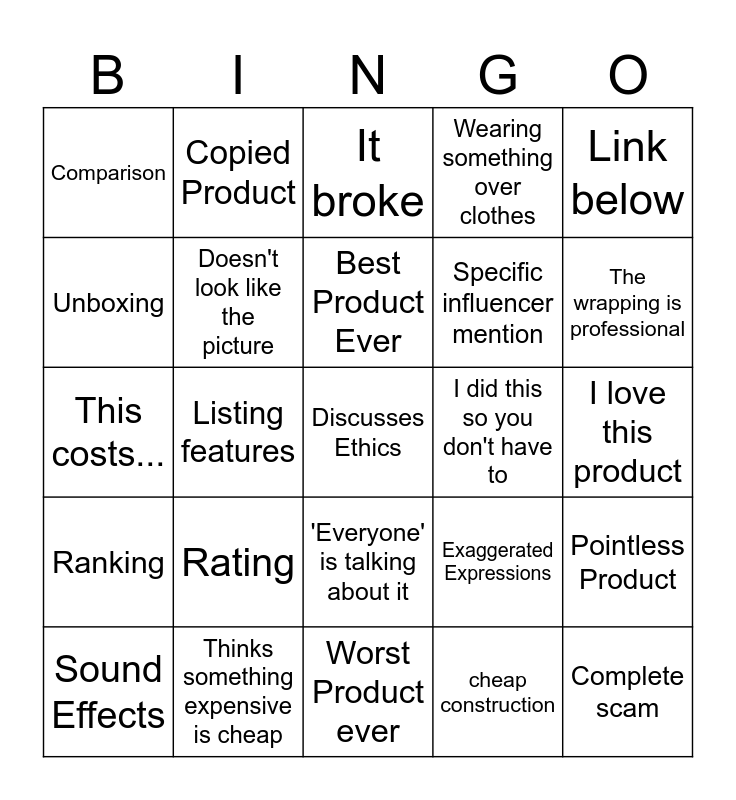 This bingo card has 25 words: Rating, Worst Product ever, Best Product Ever, Sound Effects, Link below, Comparison, Unboxing, Copied Product, I did this so you don't have to, 'Everyone' is talking about it, Specific influencer mention, This costs..., Exaggerated Expressions, Pointless Product, Doesn't look like the picture, Complete scam, I love this product, It broke, The wrapping is professional, Listing features, Discusses Ethics, Thinks something expensive is cheap, Ranking, Wearing something over clothes and cheap construction.