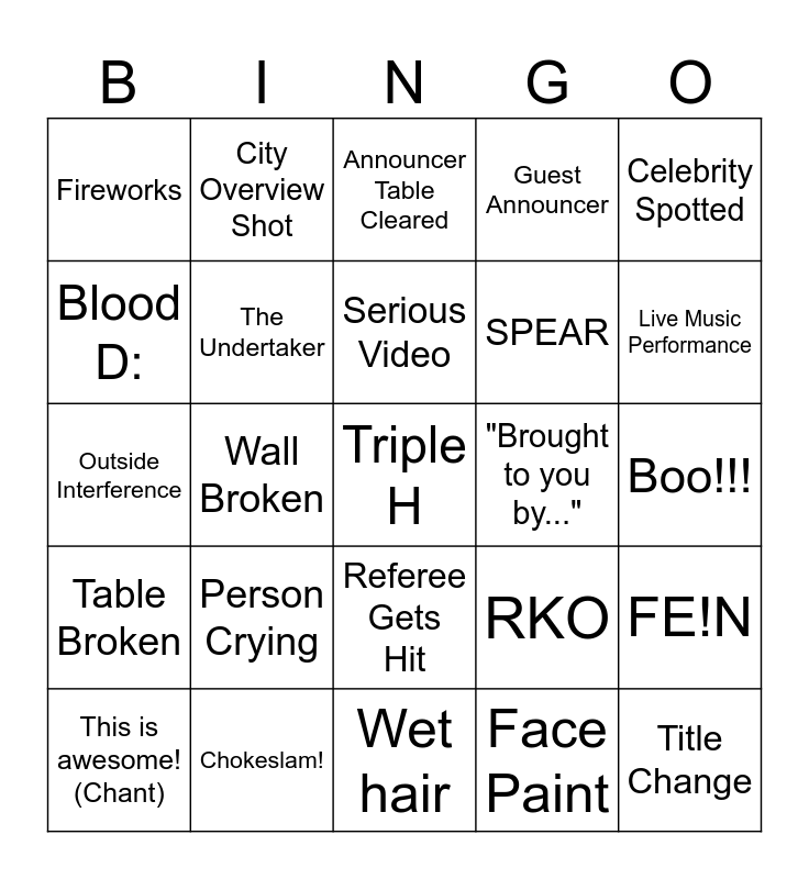 This bingo card has a free space and 29 words: This is awesome! (Chant), Betrayal..., Wall Broken, Chair Smack!, Fireworks, Announcer Table Cleared, The Undertaker, Person Crying, "Brought to you by...", Chokeslam!, Boo!!!, Title Change, Wet hair, Face Paint, Live Music Performance, Top Rope Leap!, Referee Gets Hit, Table Broken, Celebrity Spotted, Outside Interference, RKO, Flip!, SPEAR, Blood D:, Guest Announcer, City Overview Shot, FE!N, Serious Video and A Swear Word D:.
