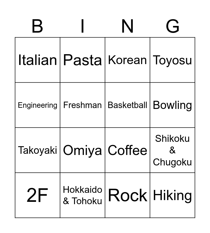 This bingo card has 16 words: Hokkaido & Tohoku, Shikoku & Chugoku, Korean, Italian, Takoyaki, Pasta, Coffee, Rock, Engineering, Freshman, 2F, Toyosu, Omiya, Bowling, Basketball and Hiking.