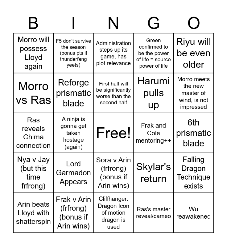 This bingo card has a free space and 24 words: Lord Garmadon Appears, Frak v Arin (frfrong) (bonus if Arin wins), First half will be significantly worse than the second half, Arin beats Lloyd with shatterspin, Riyu will be even older, Morro will possess Lloyd again, Morro vs Ras, F5 don't survive the season (bonus pts if thunderfang yeets), Frak and Cole mentoring++, Sora v Arin (frfrong) (bonus if Arin wins), Harumi pulls up, Ras reveals Chima connection, Skylar's return, Falling Dragon Technique exists, Reforge prismatic blade, Ras's master reveal/cameo, 6th prismatic blade, Administration steps up its game, has plot relevance, Morro meets the new master of wind, is not impressed, A ninja is gonna get taken hostage (again), Wu reawakened, Nya v Jay (but this time frfrong), Green confirmed to be the power of life = source power of life and Cliffhanger: Dragon Icon of motion dragon is used.