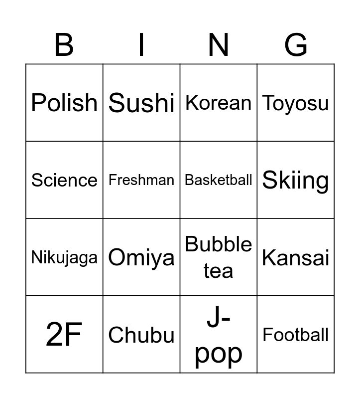 This bingo card has 16 words: Chubu, Kansai, Korean, Polish, Nikujaga, Sushi, Bubble tea, J-pop, Science, Freshman, 2F, Toyosu, Omiya, Skiing, Basketball and Football.