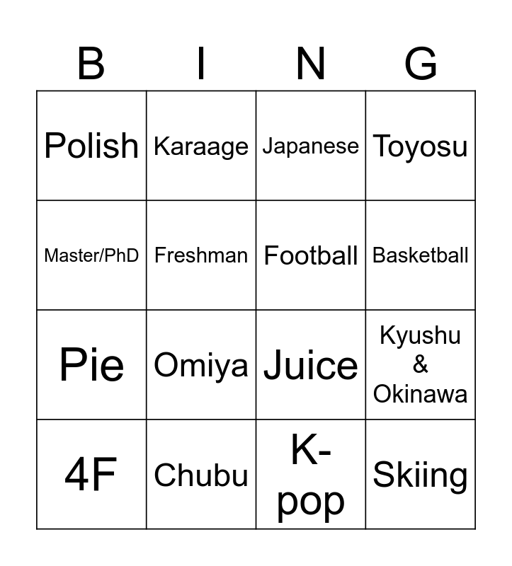 This bingo card has 16 words: Chubu, Kyushu & Okinawa, Japanese, Polish, Pie, Karaage, Juice, K-pop, Master/PhD, Freshman, 4F, Toyosu, Omiya, Basketball, Football and Skiing.