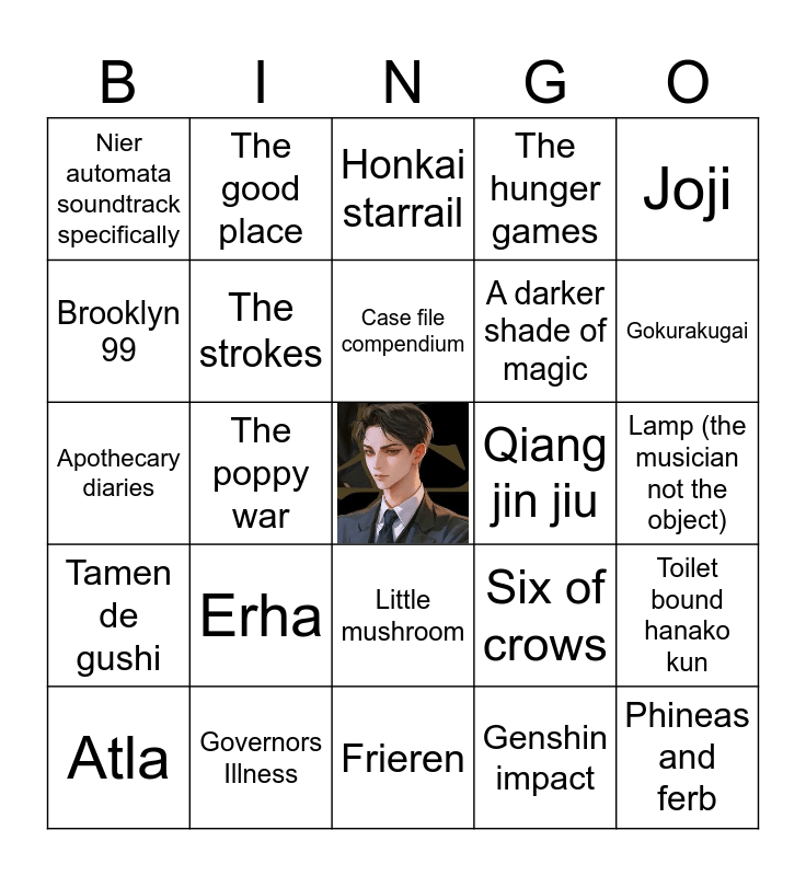 This bingo card has a free space and 24 words: Atla, Erha, Case file compendium, Genshin impact, Joji, Nier automata soundtrack specifically, The good place, Honkai starrail, Qiang jin jiu, Lamp (the musician not the object), Apothecary diaries, The strokes, Six of crows, Toilet bound hanako kun, Brooklyn 99, Governors Illness, Frieren, The hunger games, Gokurakugai, Tamen de gushi, The poppy war, Little mushroom, A darker shade of magic and Phineas and ferb.