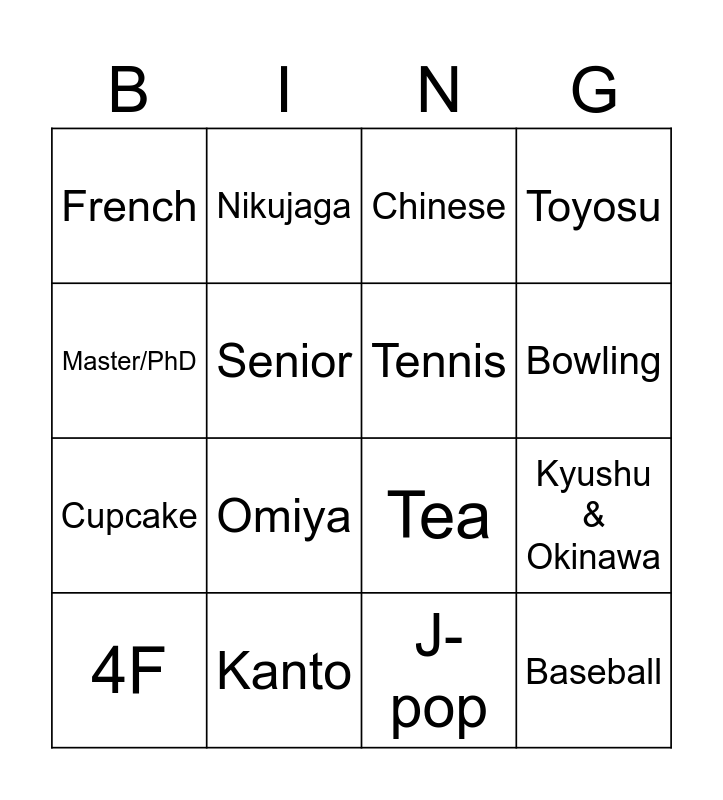 This bingo card has 16 words: Kanto, Kyushu & Okinawa, Chinese, French, Cupcake, Nikujaga, Tea, J-pop, Master/PhD, Senior, 4F, Toyosu, Omiya, Bowling, Tennis and Baseball.