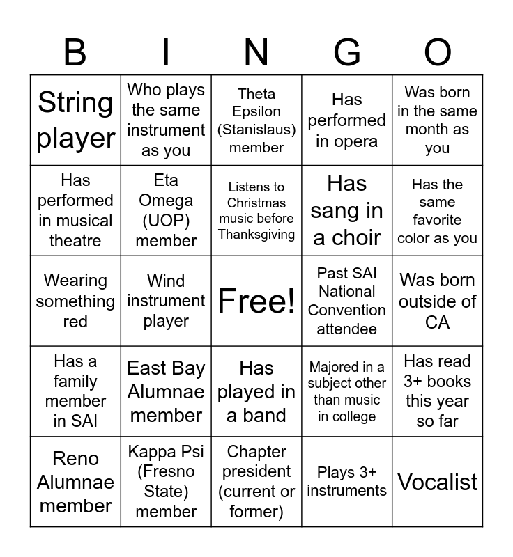 This bingo card has a free space and 29 words: Reno Alumnae member, SF Peninsula Alumnae member, Wind instrument player, Pianist, String player, Theta Epsilon (Stanislaus) member, Eta Omega (UOP) member, East Bay Alumnae member, Past SAI National Convention attendee, Kappa Psi (Fresno State) member, Was born outside of CA, Vocalist, Chapter president (current or former), Plays 3+ instruments, Has the same favorite color as you, Has played in an orchestra, Has played in a band, Has a family member in SAI, Was born in the same month as you, Wearing something red, Majored in a subject other than music in college, Has met a celebrity, Has sang in a choir, Has performed in musical theatre, Has performed in opera, Who plays the same instrument as you, Has read 3+ books this year so far, Listens to Christmas music before Thanksgiving and Has sang karaoke.