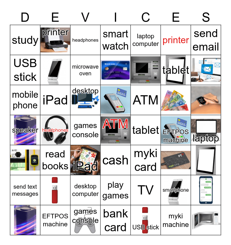 This bingo card has 26 images and 35 words: smartphone, tablet, USB stick, headphones, desktop, laptop, printer, games console, printer, cash, send email, smart watch, ATM, EFTPOS machine, USB stick, laptop computer, games console, study, microwave oven, EFTPOS machine, iPad, tablet, send text messages, desktop computer, speaker, myki card, mobile phone, iPad, play games, ATM, bank card, headphones, TV, read books and myki machine.