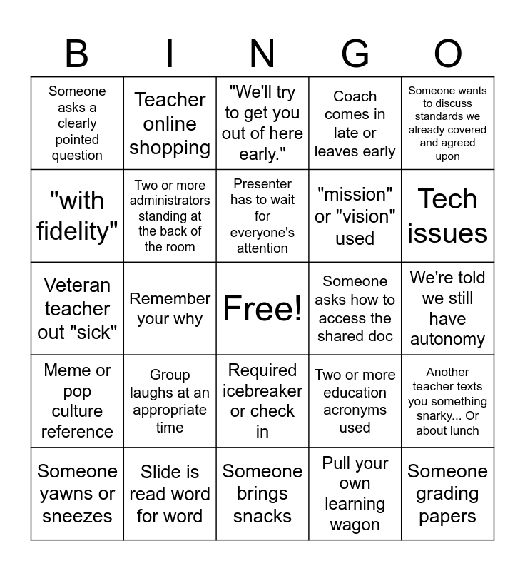 This bingo card has a free space and 32 words: Pull your own learning wagon, Presenter says, "Ok, folks", Remember your why, Priority standards, Meme or pop culture reference, Two or more administrators standing at the back of the room, Someone wants to discuss standards we already covered and agreed upon, Another teacher texts you something snarky... Or about lunch, Teacher online shopping, Someone asks an overly specific question, Presenter has to wait for everyone's attention, "We'll try to get you out of here early.", Teacher on social media on their phone, Teacher watching/checking sports, Someone asks how to access the shared doc, Presenter uses two or more metaphors, Someone yawns or sneezes, Veteran teacher out "sick", Required icebreaker or check in, Group laughs at an appropriate time, Two or more education acronyms used, Someone's phone rings loudly, We're told we still have autonomy, Slide is read word for word, Someone grading papers, Coach comes in late or leaves early, "mission" or "vision" used, "with fidelity", Someone asks a clearly pointed question, Someone brings snacks, Someone asks a relevant question and Tech issues.