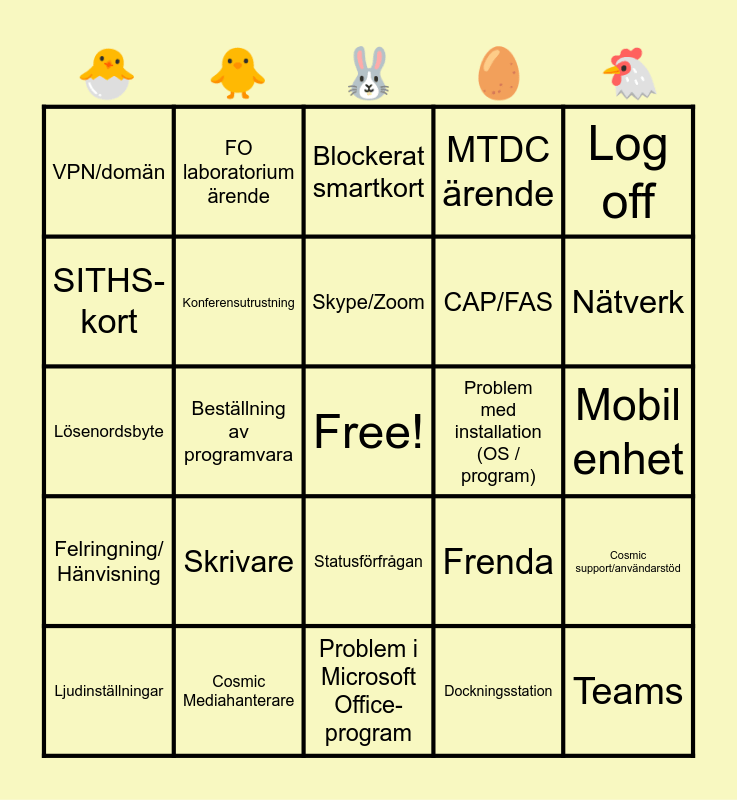 This bingo card has a free space and 28 words: Cosmic support/användarstöd, Diktering/TIK, CAP/FAS, Dockningsstation, SITHS-kort, Blockerat smartkort, FO laboratorium ärende, Felringning/ Hänvisning, Problem med installation (OS / program), Ljudinställningar, Lösenordsbyte, MTDC ärende, Cosmic Mediahanterare, Problem i Microsoft Office-program, Nätverk, Bildskärm, Skrivare, Konferensutrustning, Skype/Zoom, Statusförfrågan, VPN/domän, G: / H: saknas, Teams, Beställning av programvara, Mobil enhet, Frenda, Log off and Visningsläge i Office.