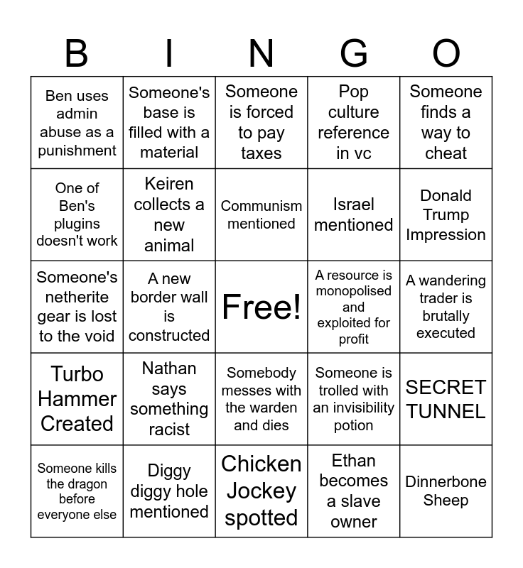 This bingo card has a free space and 24 words: Someone kills the dragon before everyone else, Nathan says something racist, Communism mentioned, Ethan becomes a slave owner, Someone finds a way to cheat, Ben uses admin abuse as a punishment, Someone's base is filled with a material, Someone is forced to pay taxes, A resource is monopolised and exploited for profit, A wandering trader is brutally executed, Someone's netherite gear is lost to the void, Keiren collects a new animal, Someone is trolled with an invisibility potion, SECRET TUNNEL, One of Ben's plugins doesn't work, Diggy diggy hole mentioned, Chicken Jockey spotted, Pop culture reference in vc, Donald Trump Impression, Turbo Hammer Created, A new border wall is constructed, Somebody messes with the warden and dies, Israel mentioned and Dinnerbone Sheep.