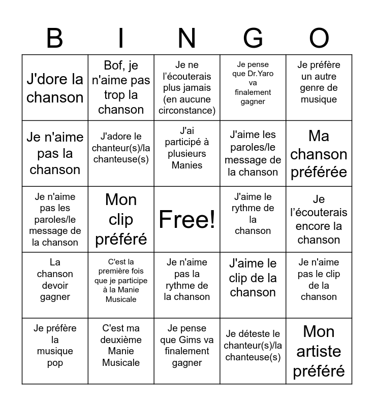 This bingo card has a free space and 24 words: C'est la première fois que je participe à la Manie Musicale, C'est ma deuxième Manie Musicale, J'ai participé à plusieurs Manies, Je préfère la musique pop, Je préfère un autre genre de musique, J'dore la chanson, Je n'aime pas la chanson, Bof, je n'aime pas trop la chanson, J'aime le rythme de la chanson, Je n'aime pas la rythme de la chanson, J'aime les paroles/le message de la chanson, Je n'aime pas les paroles/le message de la chanson, J'aime le clip de la chanson, Je n'aime pas le clip de la chanson, J'adore le chanteur(s)/la chanteuse(s), Je déteste le chanteur(s)/la chanteuse(s), Je l’écouterais encore la chanson, Je ne l’écouterais plus jamais (en aucune circonstance), Ma chanson préférée, Mon clip préféré, Mon artiste préféré, La chanson devoir gagner, Je pense que Dr.Yaro va finalement gagner and Je pense que Gims va finalement gagner.