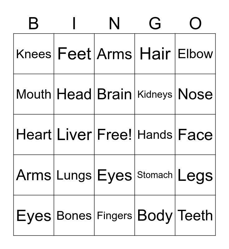 This bingo card has a free space and 24 words: Lungs, Bones, Brain, Eyes, Elbow, Knees, Mouth, Feet, Hands, Eyes, Kidneys, Heart, Stomach, Legs, Head, Body, Face, Arms, Nose, Liver, Teeth, Arms, Hair and Fingers.