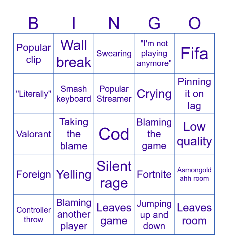 This bingo card has a free space and 34 words: Smash desk, Jumping up and down, Slurs, CSGO, Foreign, Smash keyboard, Fifa, Controller throw, Wall break, Female, Popular Streamer, Swearing, League of Legends, Fall off chair, Blaming the game, Pinning it on lag, Blaming another player, Valorant, Yelling, Fortnite, Silent rage, Dark souls/ Elden ring, Popular clip, Low quality, Leaves game, Leaves room, "I'm not playing anymore", Headset throw, Crying, "Literally", "Why me", Taking the blame, Asmongold ahh room and Camera falls.