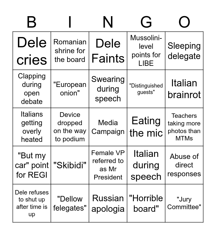 This bingo card has a free space and 24 words: "Skibidi", "Dellow felegates", Swearing during speech, Dele refuses to shut up after time is up, Sleeping delegate, Dele cries, Clapping during open debate, Romanian shrine for the board, Eating the mic, Female VP referred to as Mr President, "Distinguished guests", Italians getting overly heated, Italian during speech, Abuse of direct responses, "European onion", "Horrible board", Teachers taking more photos than MTMs, Dele Faints, Italian brainrot, Device dropped on the way to podium, "Jury Committee", "But my car" point for REGI, Mussolini-level points for LIBE and Russian apologia.