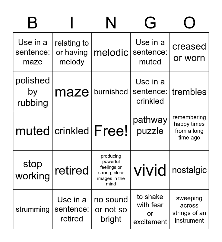 This bingo card has a free space and 24 words: retired, Use in a sentence: retired, burnished, strumming, creased or worn, Use in a sentence: maze, polished by rubbing, relating to or having melody, pathway puzzle, producing powerful feelings or strong, clear images in the mind, Use in a sentence: crinkled, muted, vivid, nostalgic, maze, to shake with fear or excitement, remembering happy times from a long time ago, melodic, trembles, crinkled, sweeping across strings of an instrument, stop working, Use in a sentence: muted and no sound or not so bright.
