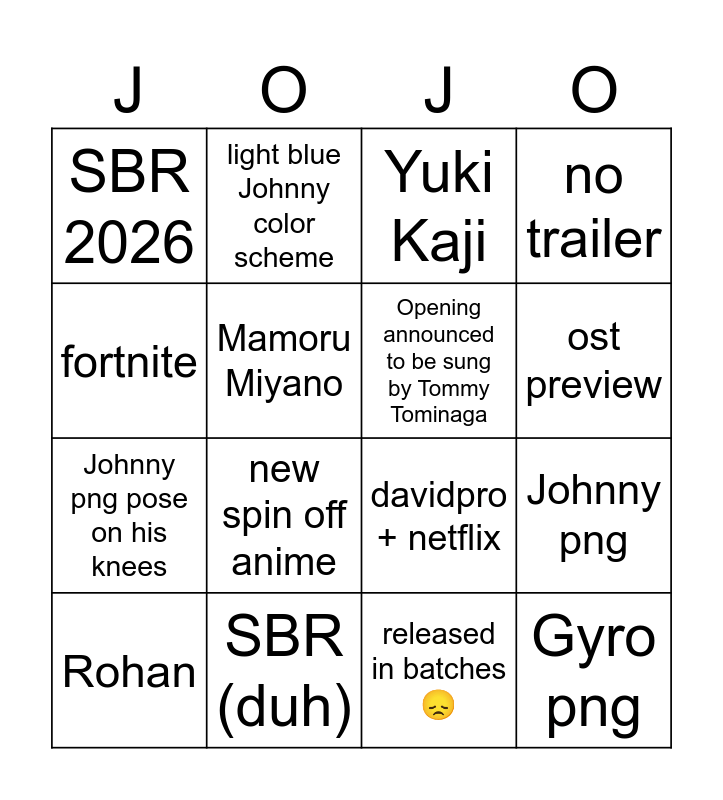 This bingo card has 16 words: SBR (duh), Johnny png, Yuki Kaji, SBR 2026, Johnny png pose on his knees, light blue Johnny color scheme, davidpro + netflix, released in batches 😞, fortnite, Mamoru Miyano, Rohan, no trailer, new spin off anime, ost preview, Opening announced to be sung by Tommy Tominaga and Gyro png.