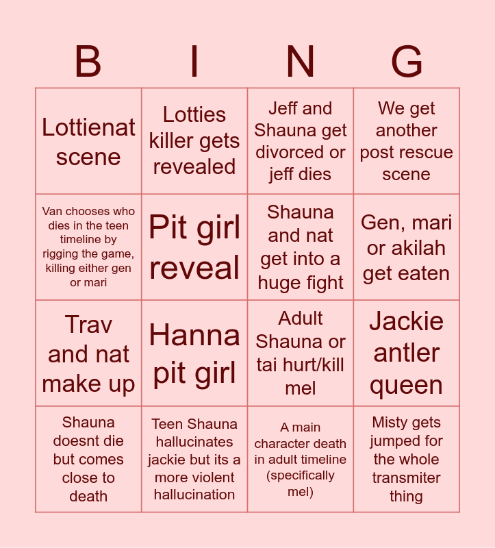 This bingo card has 16 words: Teen Shauna hallucinates jackie but its a more violent hallucination, Jackie antler queen, Jeff and Shauna get divorced or jeff dies, Lottienat scene, Trav and nat make up, Lotties killer gets revealed, Adult Shauna or tai hurt/kill mel, A main character death in adult timeline (specifically mel), Van chooses who dies in the teen timeline by rigging the game, killing either gen or mari, Pit girl reveal, Shauna doesnt die but comes close to death, We get another post rescue scene, Hanna pit girl, Gen, mari or akilah get eaten, Shauna and nat get into a huge fight and Misty gets jumped for the whole transmiter thing.