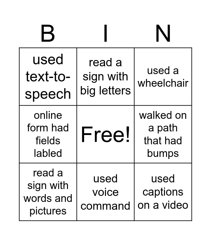This bingo card has a free space and 20 words: used dark mode, touched braille, used a wheelchair, used handrails for balance, seen a white cane in person, used captions on a video, enlarged text on a website, used text-to-speech, used an elevator, read a sign with big letters, used a door with an automatic sensor, used a tactile map, walked on a path that had bumps, seen priority seating, read a sign with words and pictures, seen sign language on the TV, used voice command, online form had fields labled, changed the brightness of your phone and had an article read to you by the phone.