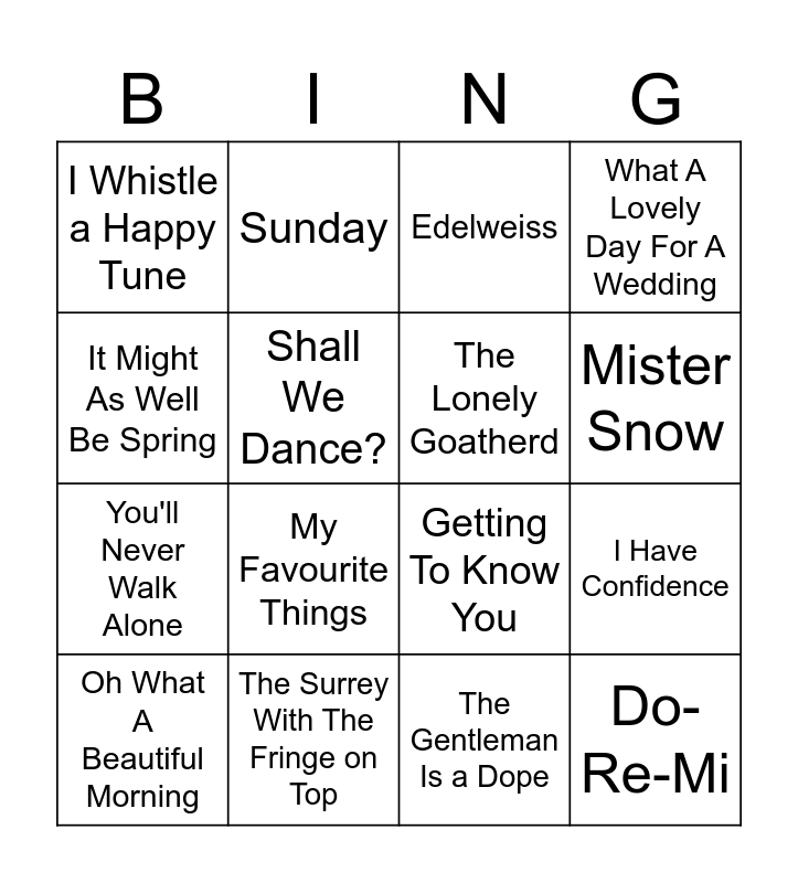 This bingo card has 20 words: I Have Confidence, Maria, Edelweiss, I'm Gonna Wash That Man Right Outta My Hair, Oh What A Beautiful Morning, It Might As Well Be Spring, The Surrey With The Fringe on Top, I Whistle a Happy Tune, You'll Never Walk Alone, Sunday, My Favourite Things, Getting To Know You, Shall We Dance?, Do-Re-Mi, The Lonely Goatherd, I Cain't Say No, Mister Snow, What A Lovely Day For A Wedding, The Gentleman Is a Dope and My Girl Back Home.