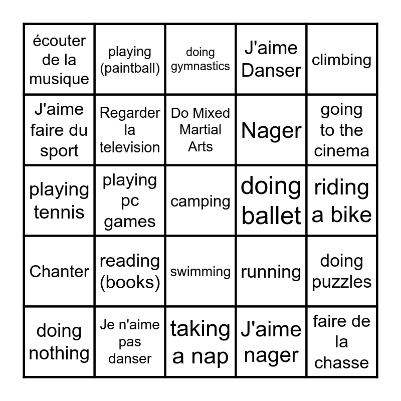 This bingo card has 60 words: Dessiner, Je n'aime pas danser, Jouer, Chanter, J'aime nager, J'adore jouer, Regarder la television, J'aime chanter, Nager, Danser, J'aime Danser, J'adore nager, J'aime faire du sport, Je n'aime pas dessiner, J'aime Regarder la television, écouter de la musique, camping, climbing, cooking, Do Mixed Martial Arts, doing ballet, doing gymnastics, doing nothing, doing puzzles, drawing, Fencing, fishing, going to concerts, going to the cinema, hiking, hobbies, ice skating, listening to music, making videos, playing (paintball), playing cards, playing football, playing pc games, playing phone games, playing tennis, playing the guitar, reading (books), riding a bike, riding a horse, running, scuba diving, shopping, singing (songs), surfing the web, swimming, taking a nap, taking photos, To dance, walking, walking my dog, watching TV, jouer au softball, jouer à la balle molle, faire de la chasse and surfer.