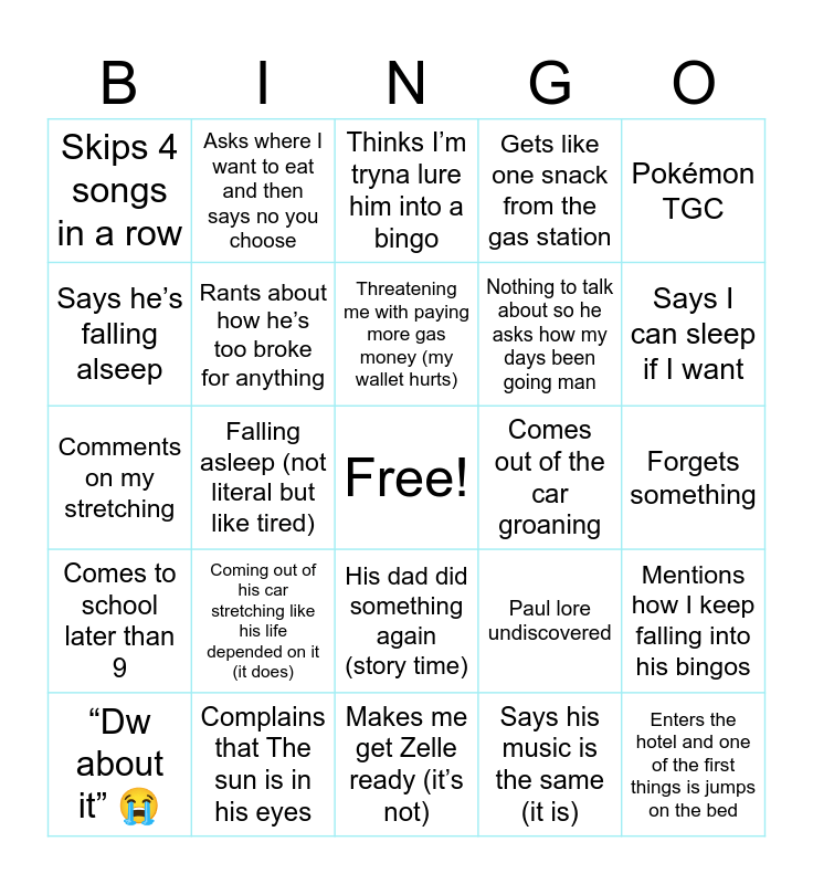 This bingo card has a free space and 24 words: Coming out of his car stretching like his life depended on it (it does), Complains that The sun is in his eyes, Threatening me with paying more gas money (my wallet hurts), “Dw about it” 😭, Pokémon TGC, Skips 4 songs in a row, Says he’s falling alseep, Asks where I want to eat and then says no you choose, Comes out of the car groaning, His dad did something again (story time), Nothing to talk about so he asks how my days been going man, Comments on my stretching, Paul lore undiscovered, Mentions how I keep falling into his bingos, Rants about how he’s too broke for anything, Says his music is the same (it is), Forgets something, Thinks I’m tryna lure him into a bingo, Says I can sleep if I want, Falling asleep (not literal but like tired), Enters the hotel and one of the first things is jumps on the bed, Comes to school later than 9, Gets like one snack from the gas station and Makes me get Zelle ready (it’s not).